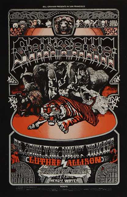 Bill Graham moved his Fillmore Auditorium to the Carousel Ballroom on South Van Ness Avenue in 1968, and renamed it the Fillmore West (he also owned the Fillmore East in Manhattan). Building on an already world famous reputation, Graham would continue to feature the best of the best until the venue's final days in 1971. Everyone who was anyone on the scene performed at the Fillmore West, from Jimi Hendrix to Jefferson Airplane - and Graham was known for mixing it up in his bookings for a single night, featuring pure psychedelic rock acts on the same ticket as major blues and/or jazz groups. These were the days of affordable ticket prices and pretty intimate settings - so the crowds packed in and history was made night after night. Graham also hired professional artists to create some of the most iconic posters of the era - here are a couple from 1968 and 1970 that feature Santana alongside a handful of other amazing bands ...
